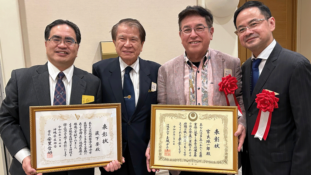 沖縄県の保健医療の向上と発展に貢献したとして、当院の理事長宮良球一郎が、令和5年度の「医事功労者沖縄県知事表彰」を受賞しました。翌年1月には、沖縄県医師会新年祝賀会にて表彰式が行われ、沖縄県知事より表彰状と、記念品として琉球泡ガラスの第一人者稲嶺盛一郎さんの花器が授与されました。