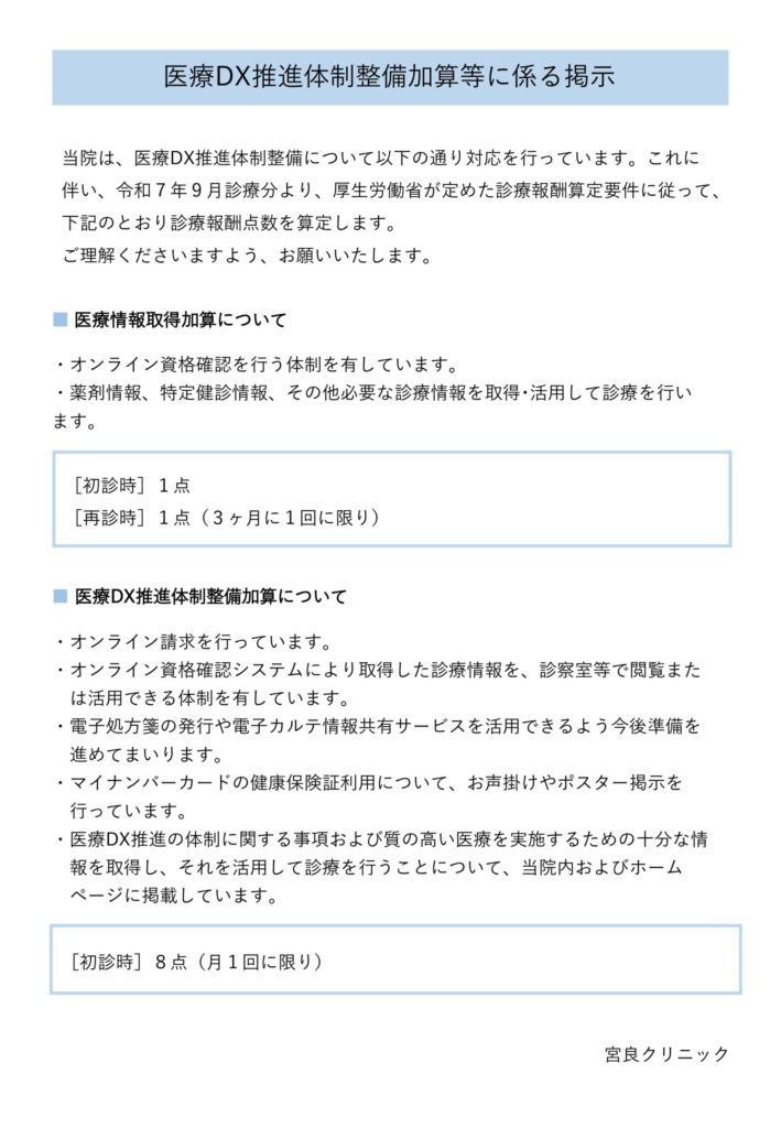 TOP >お知らせ > 医療DX推進体制整備加算等に係る掲示カテゴリーお知らせ診療案内採用情報メディアコラム 2025.08.01 お知らせ医療DX推進体制整備加算等に係る掲示医療DX推進体制整備加算等の掲示(宮良クリニック)前に戻る