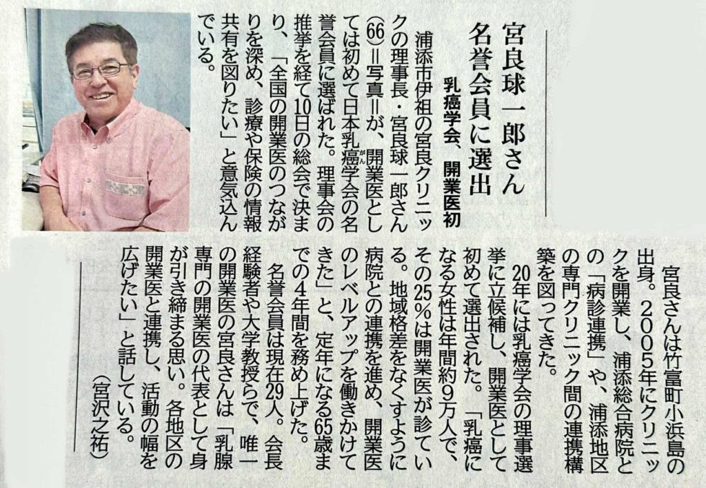名誉会員は現在29人。会長経験者や大学教授らで、唯一の開業医の宮良さんは「乳腺専門の開業医の代表として身が引き締まる思い。各地区の開業医と連携し、活動の幅を広げたい」と話している。